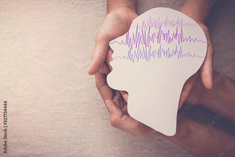 Tableau sur toile Adult and child hands holding encephalography brain paper cutout, Epilepsy aware