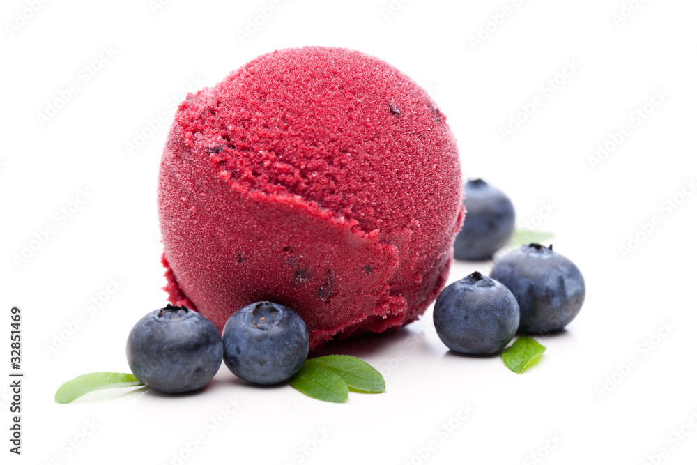 Tableau sur toile Eine Kugel Eis mit Heidelbeeren auf weißem Hintergrund