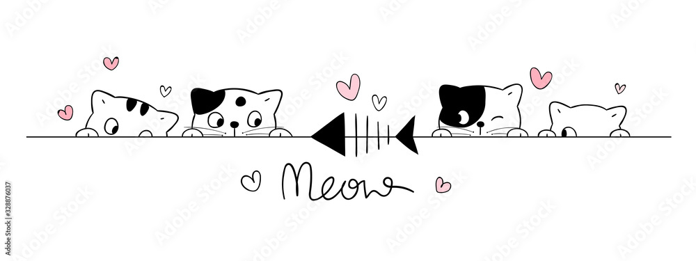 Tableau sur toile Draw cute cats look at fish on white.