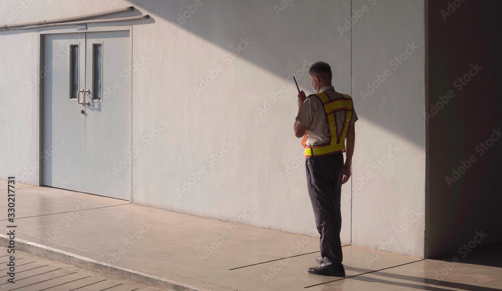 Tableau sur toile Asian security guard in safety vest walking on sidewalk and using walkie talkie