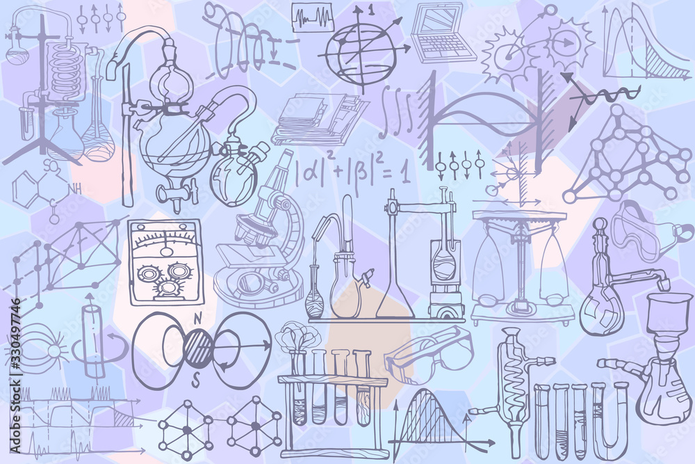 Tableau sur toile Physics or chemistry abstract illustration with parts of decorative tools and diagrams on white board