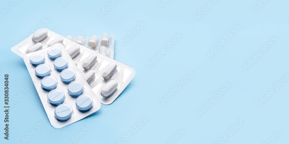 Tableau sur toile Pills in blister packs on blue background. Medicine concept.