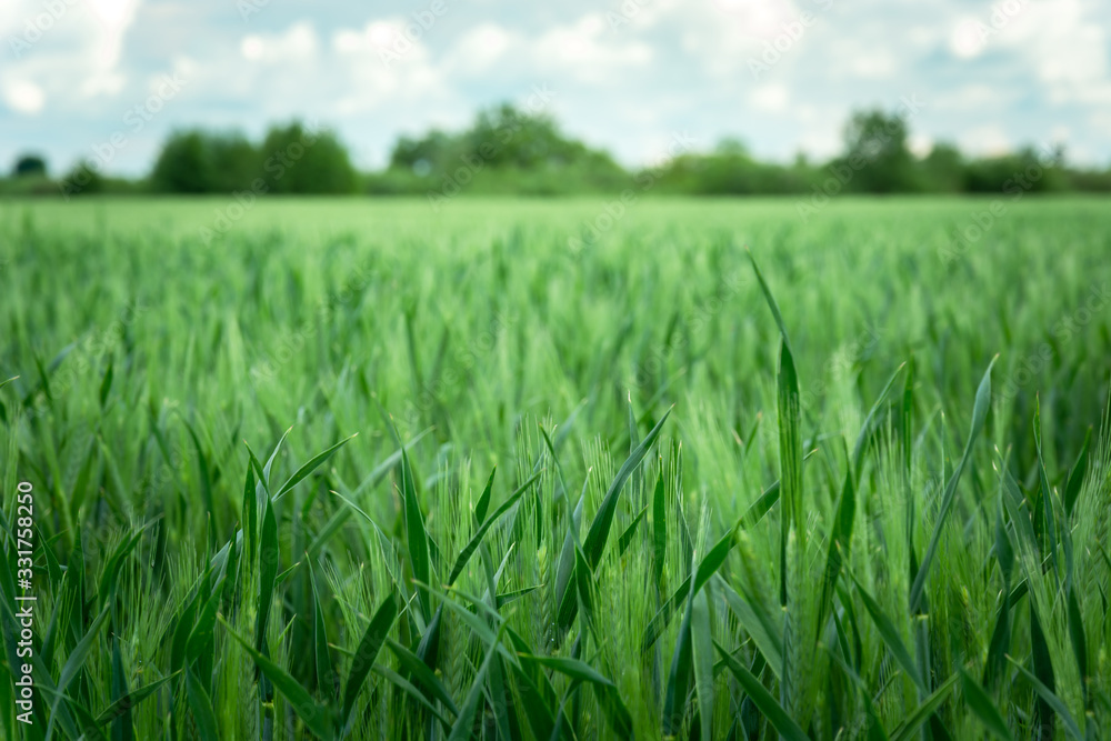 Tableau sur toile Green barley field, zooming in and focusing on the foreground