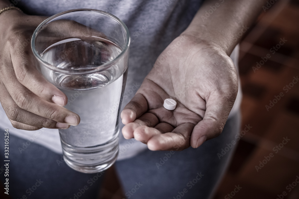 Tableau sur toile Close up of girl holding paracetamol and glass of water.