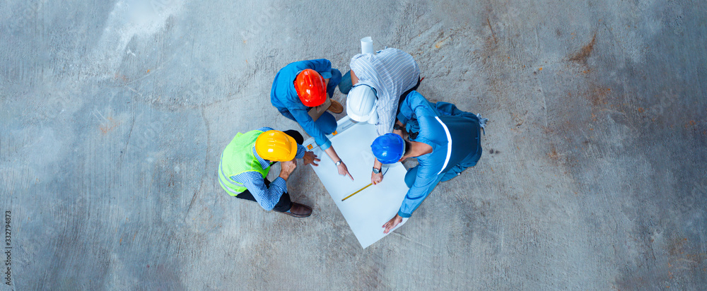Tableau sur toile Top view group of Engineers and architects are meeting on his blueprints with documents on construction site