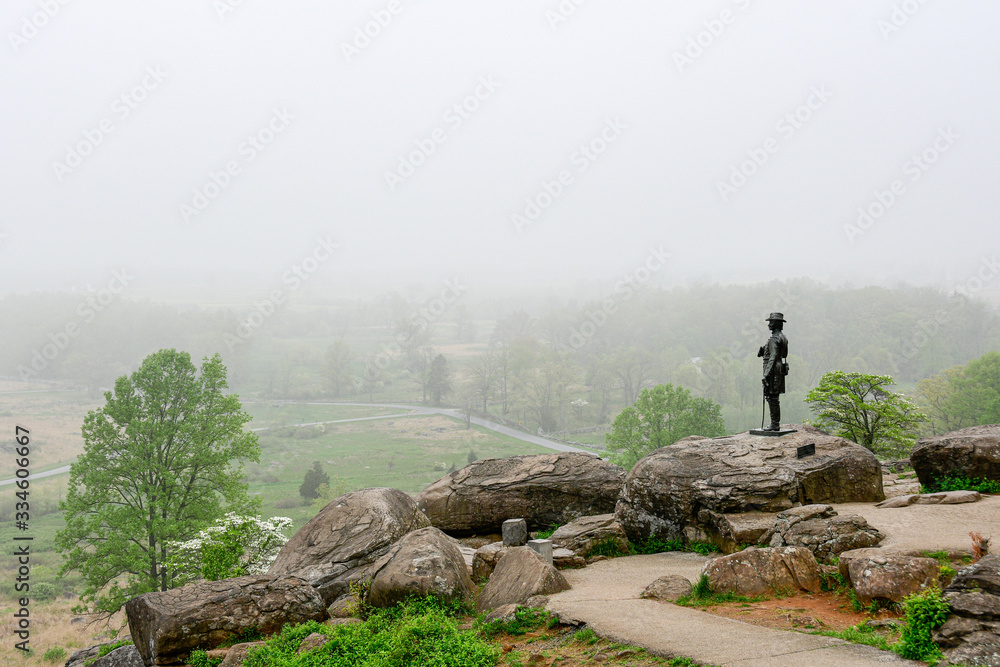 Tableau sur toile Little Round Top at Civil War battlefield with statue of General Warren, Gettysburg, Pennsylvania