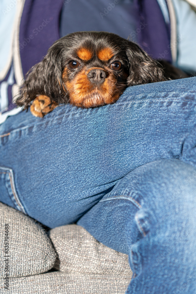 Tableau sur toile Close up of a cute dog's face as she rests on her owner's lap