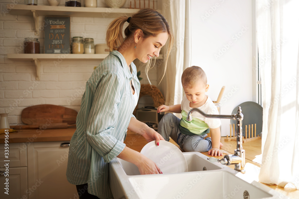 Tableau sur toile Indoor shot of cute positive young European female with ponytail posing in kitch