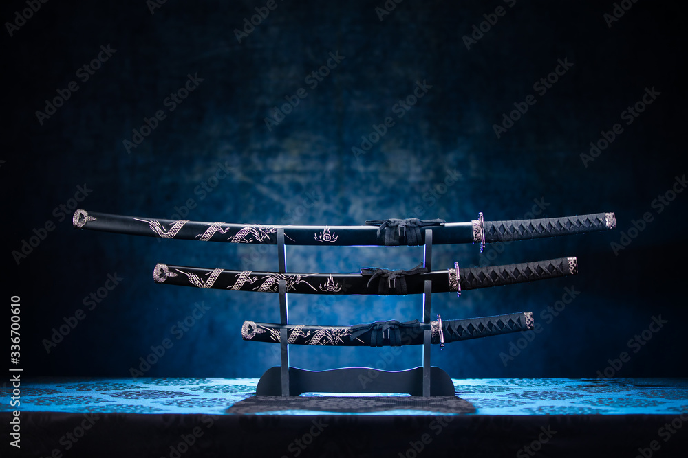 Tableau sur toile Three swords on stand, with dramatic blue light