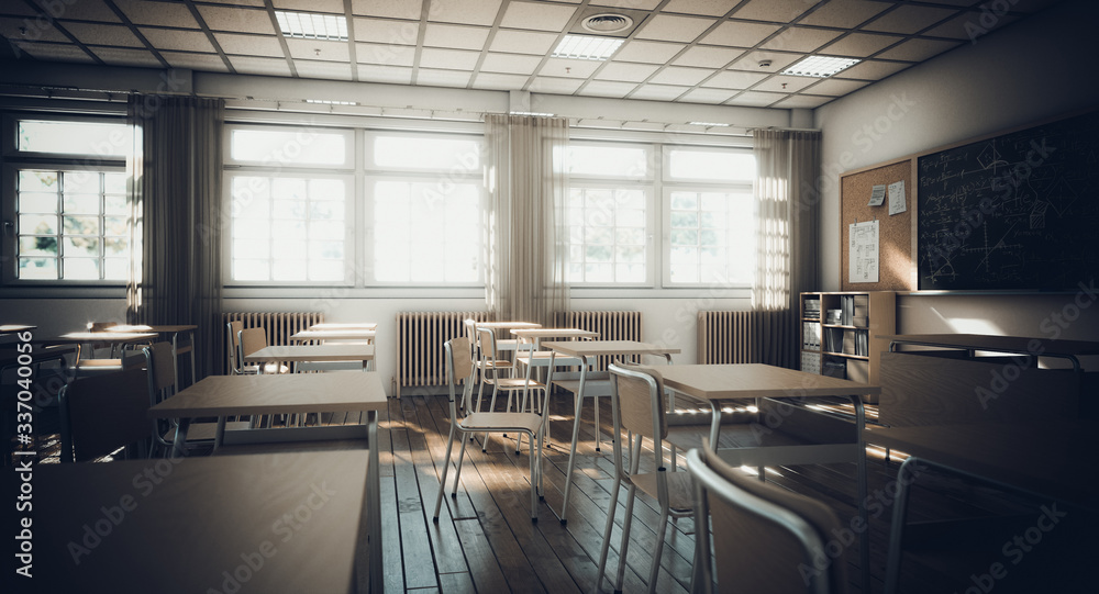 Tableau sur toile interior of a traditional school with wooden desks and chairs.