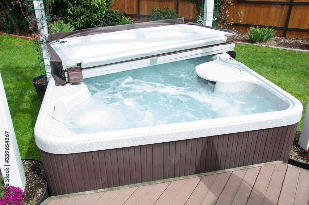 Tableau sur toile Hot tub in back yard with water bubbling and the lid half off, ready to be enjoyed in the outdoors