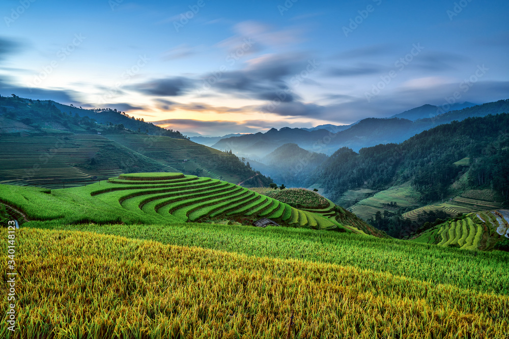 Tableau sur toile Beautiful step of rice terrace paddle field in sunset and dawn at Mam Xoi hill, Mu Cang Chai, Vietnam