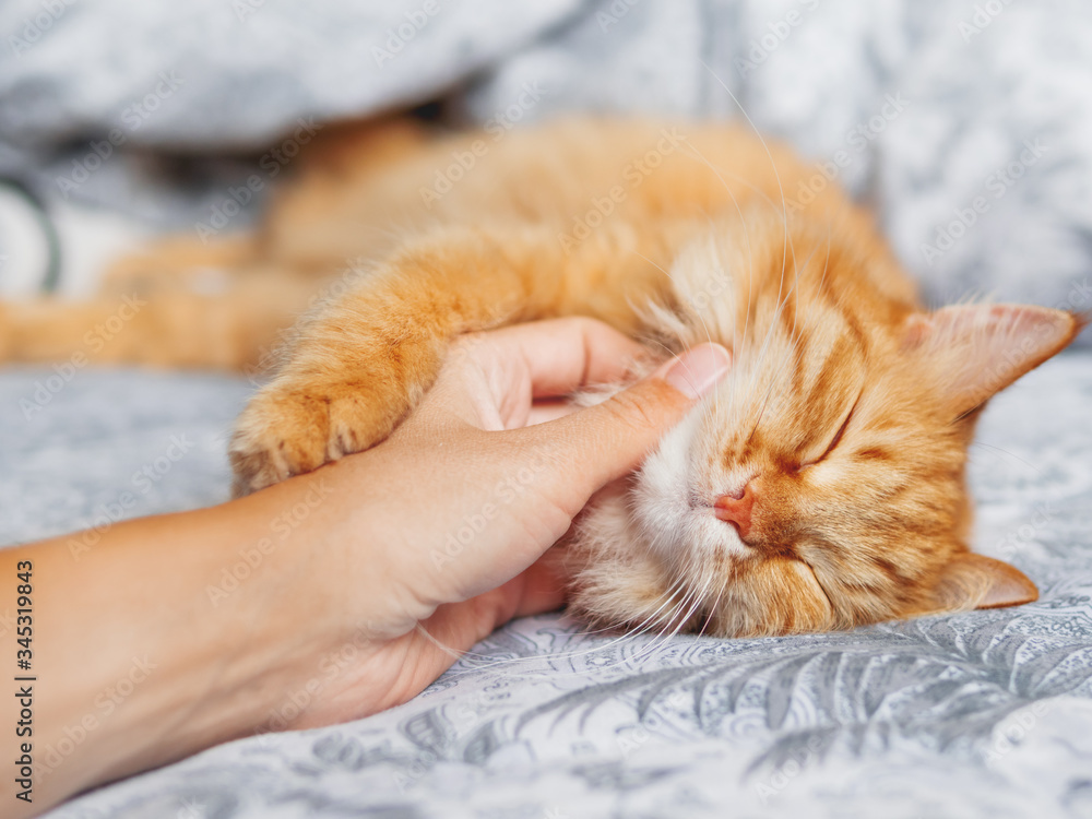 Tableau sur toile Woman strokes cute ginger cat sleeping in bed