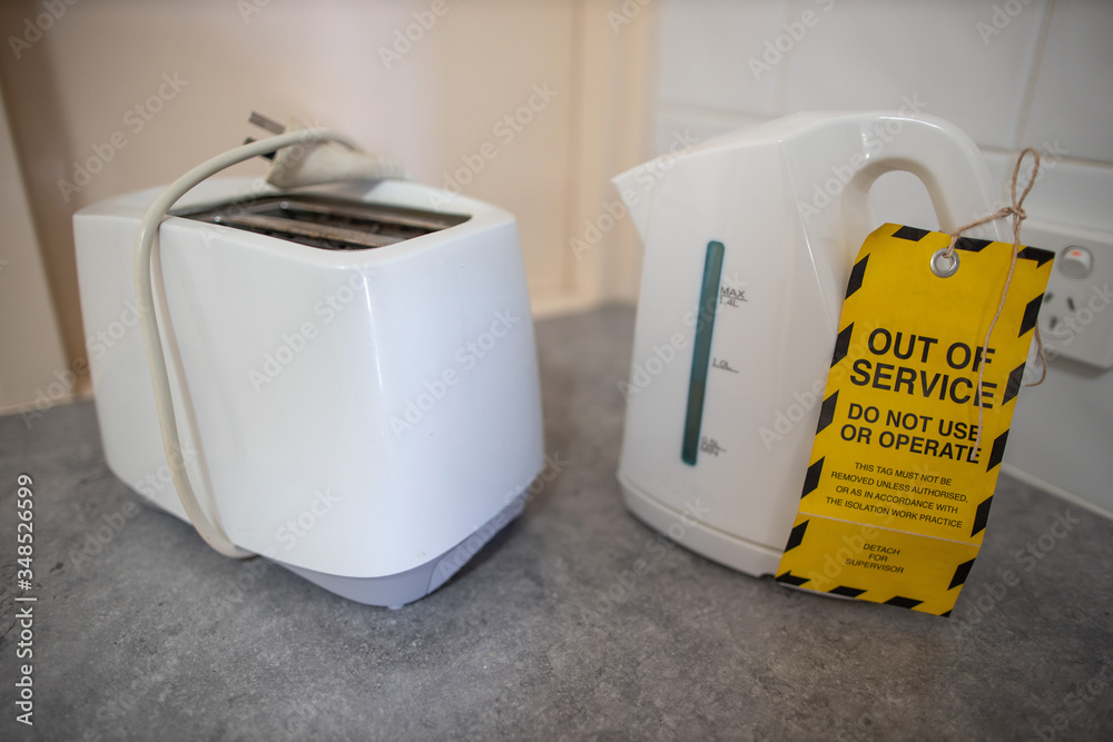 Tableau sur toile Safe workplaces yellow out of service tag placing on electricity kettle unit on