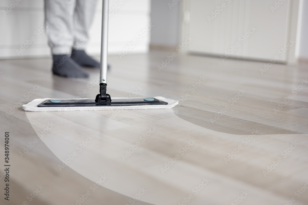 Tableau sur toile before and after cleaning concept - man cleaning wooden floor with mop in living