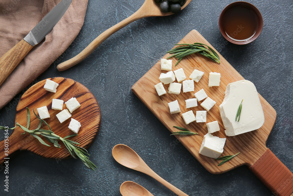 Tableau sur toile Composition with tasty cut feta cheese on table
