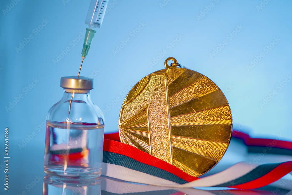 Tableau sur toile Doping in Sport, Gold medal for victory, syringe, glass bottle with doping