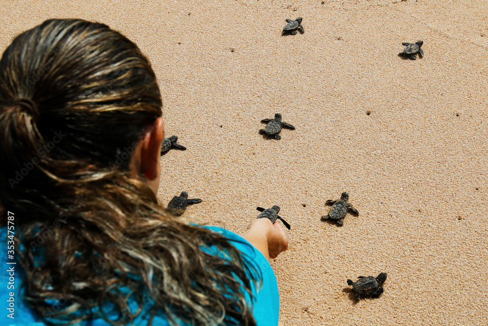 Tableau sur toile Hatchling baby hawksbill sea turtle (Eretmochelys imbricata) release to the sea