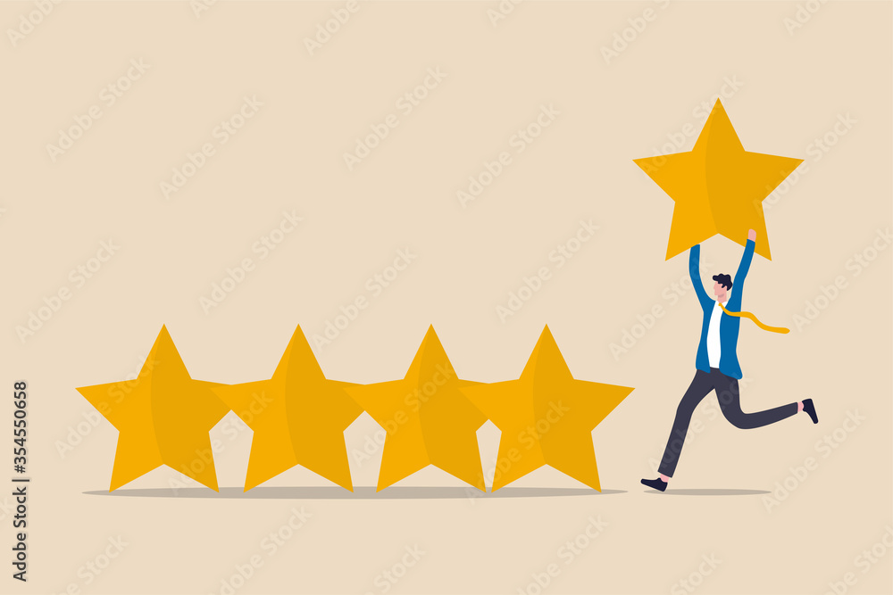 Tableau sur toile User experience, customer feedback stars rating or business and investment rating concept, businessman holding golden yellow star to added to 5 stars rating