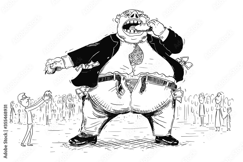 Tableau sur toile Vector cartoon drawing conceptual illustration of fat rich man, businessman or capitalist in suit and money in pockets is eating food of crowd poor small people around