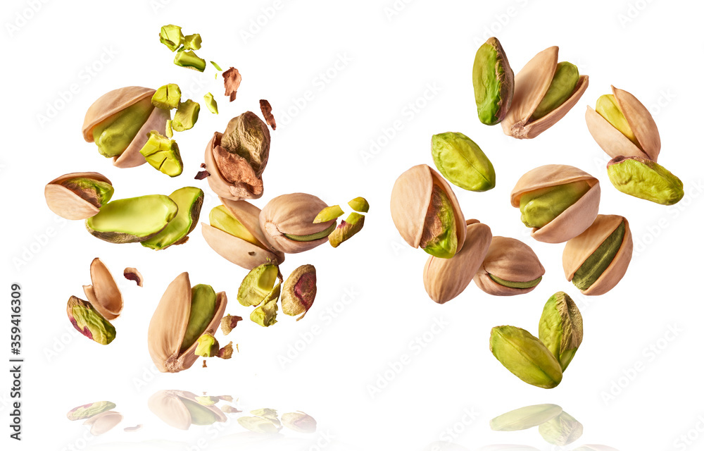Tableau sur toile A set with Flying in air fresh raw whole and cracked pistachios isolated on white background