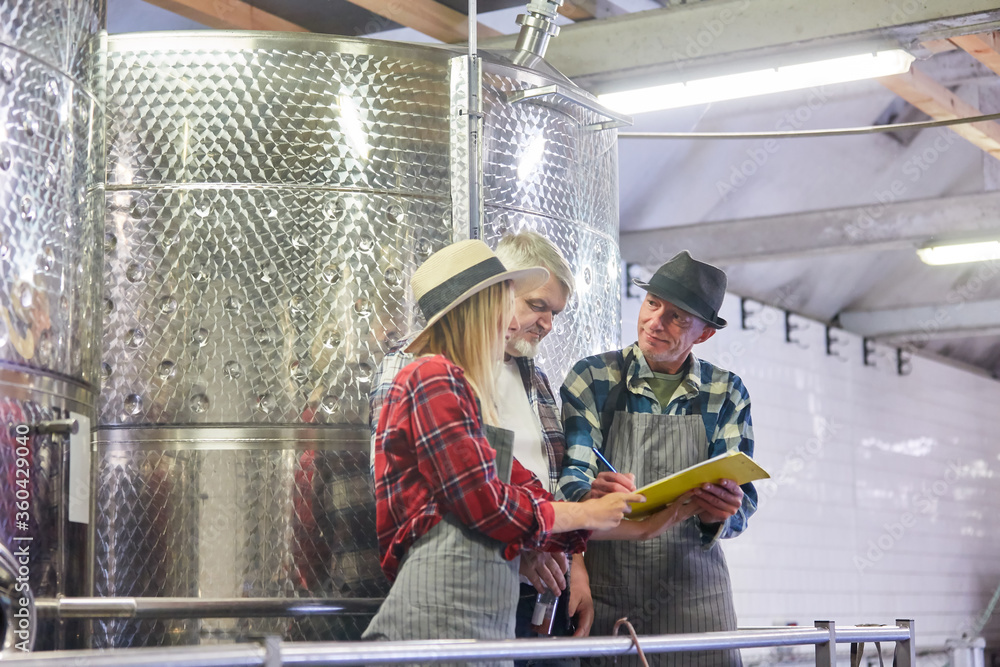 Tableau sur toile Winemaker and team with checklist in the wine cellar
