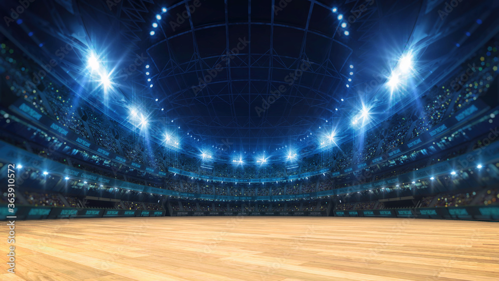 Tableau sur toile Sport stadium with grandstands full of fans, shining night lights and wooden deck