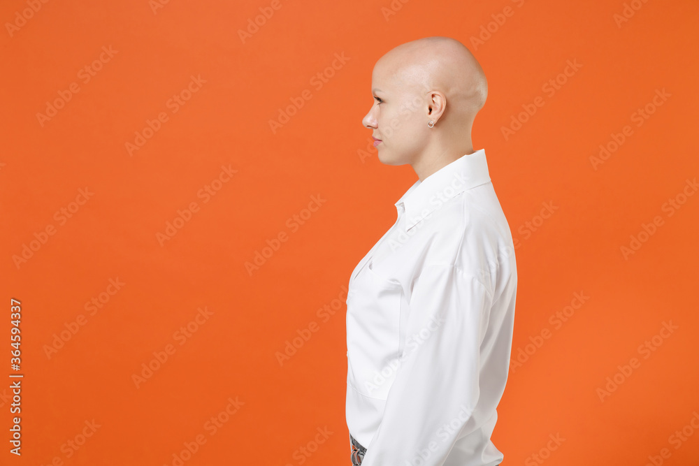 Tableau sur toile Side view of young bald business woman girl in white shirt posing isolated on orange wall background studio portrait