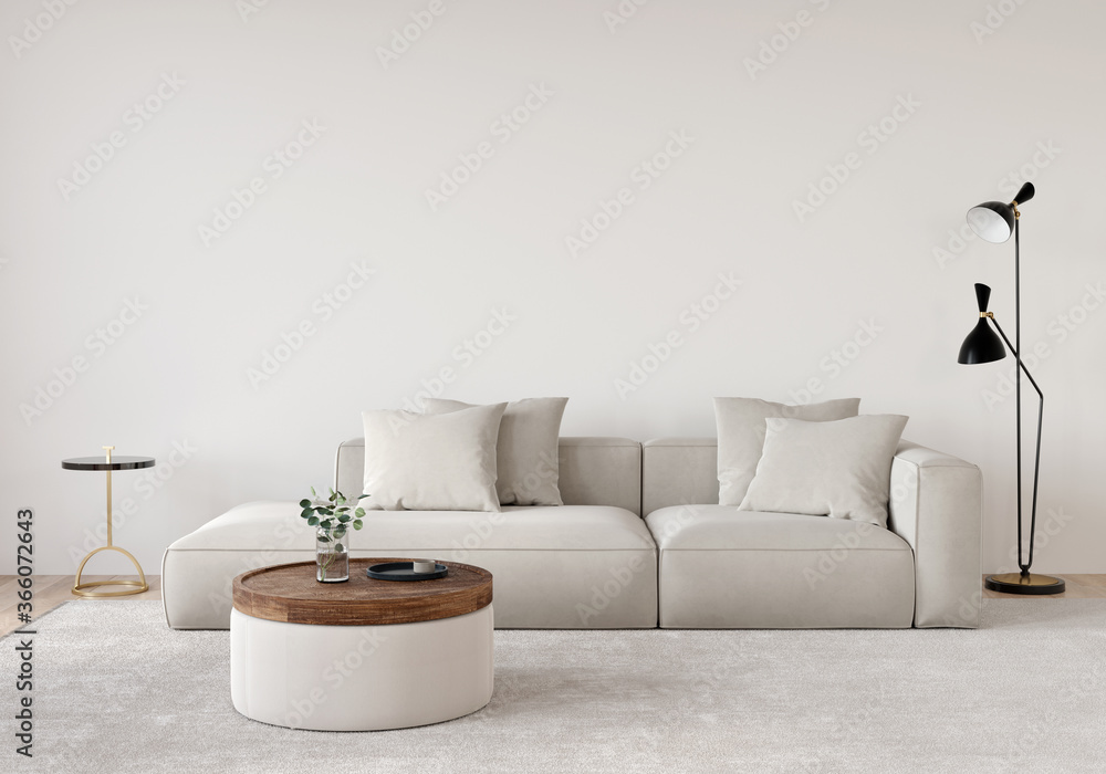 Tableau sur toile Living room in beige tones with a sofa, a floor lamp, a wooden table and a gold