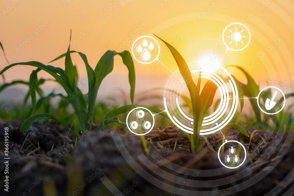 Growing young maize seedling in cultivated agricultural farm field with modern technology concepts