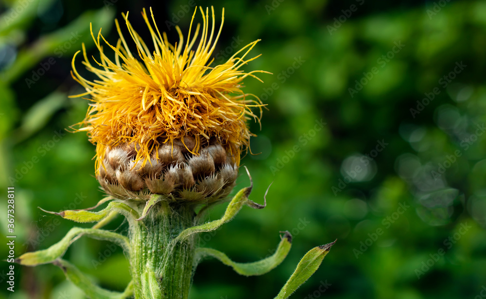 Tableau sur toile Side view of close up yellow large headed knapweed (Centaurea macrocephala, Aste