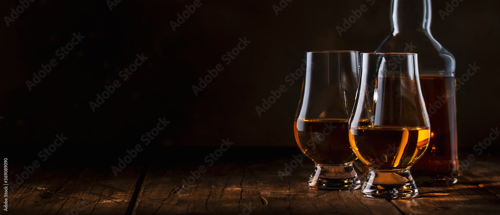 Tableau sur toile Scotch Whiskey without ice in glasses and bottle, rustic wood background, copy s