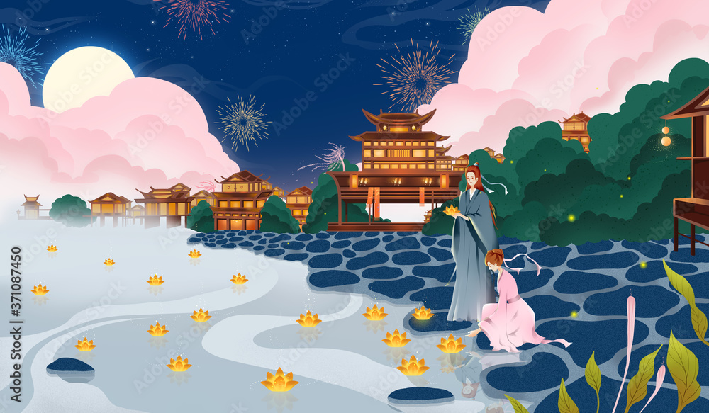 Tableau sur toile Couples in ancient costumes are setting the river lantern
