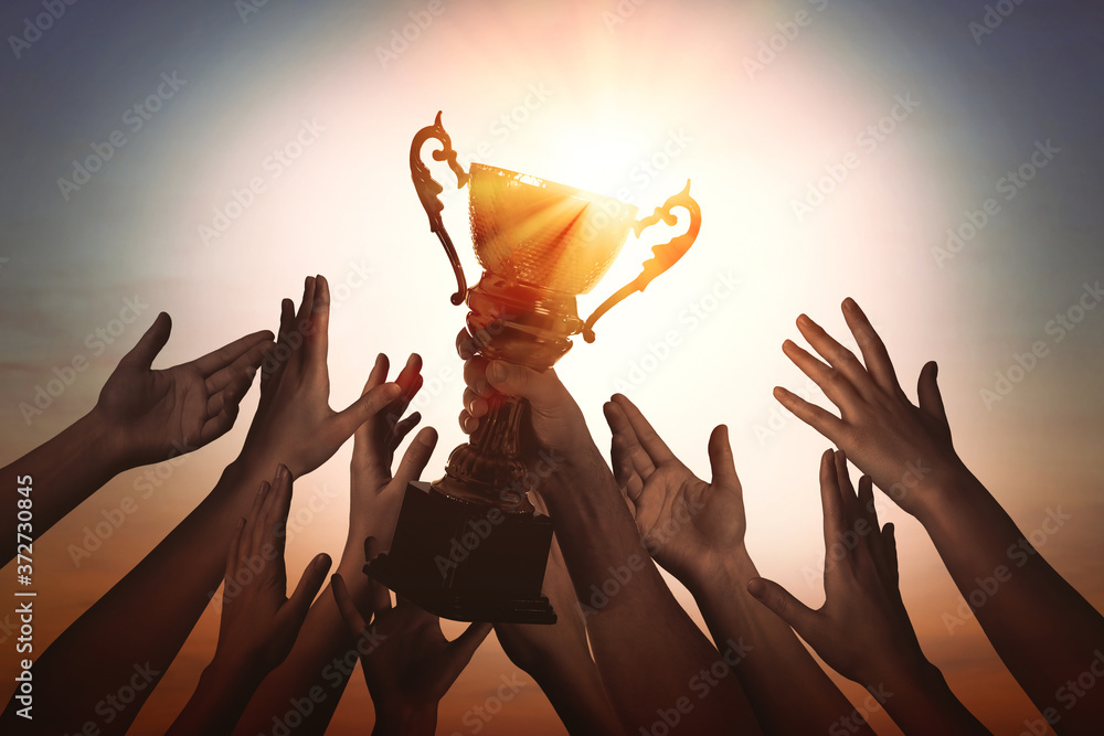 Tableau sur toile Winning team with gold trophy cup against shining sun in sky