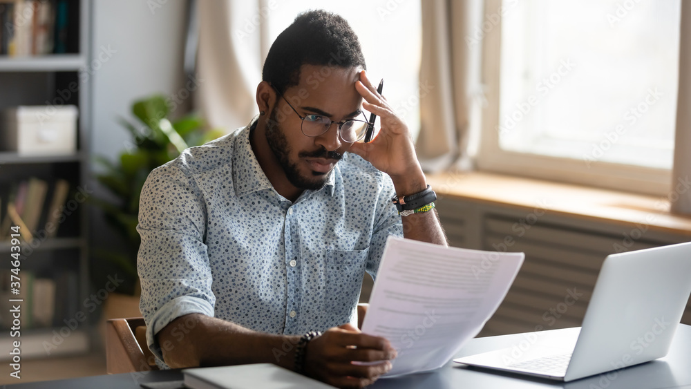 Tableau sur toile Stressed dissatisfied African American businessman reading letter with bad news,