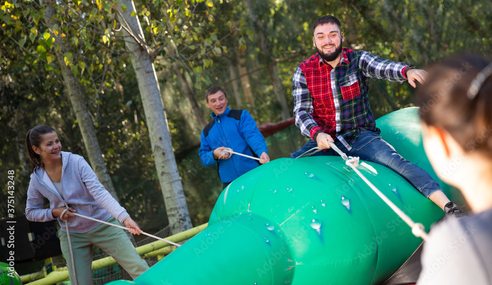 Tableau sur toile Emotional bearded young man sitting astride big inflatable rodeo bottle, having