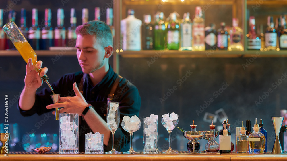 Tableau sur toile Young male bartender pouring, mixing ingredients while making classic cocktail a