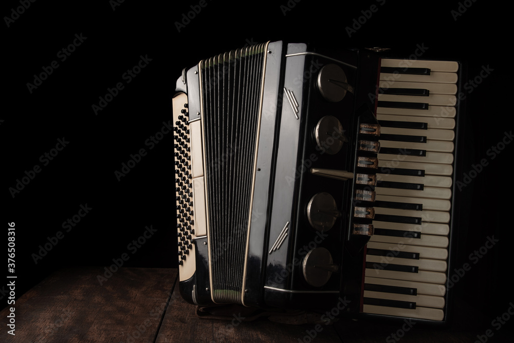 Tableau sur toile Old accordion on rustic wooden surface with black background and Low key lighting, selective focus