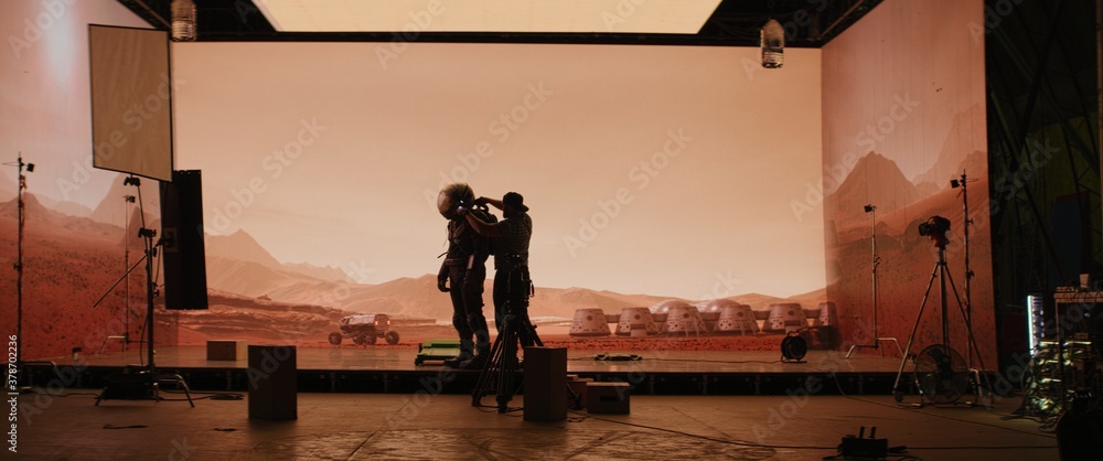 Tableau sur toile Behind the scenes shot of virtual production stage with huge LED screens, cinematorgapher shooting Mars scene
