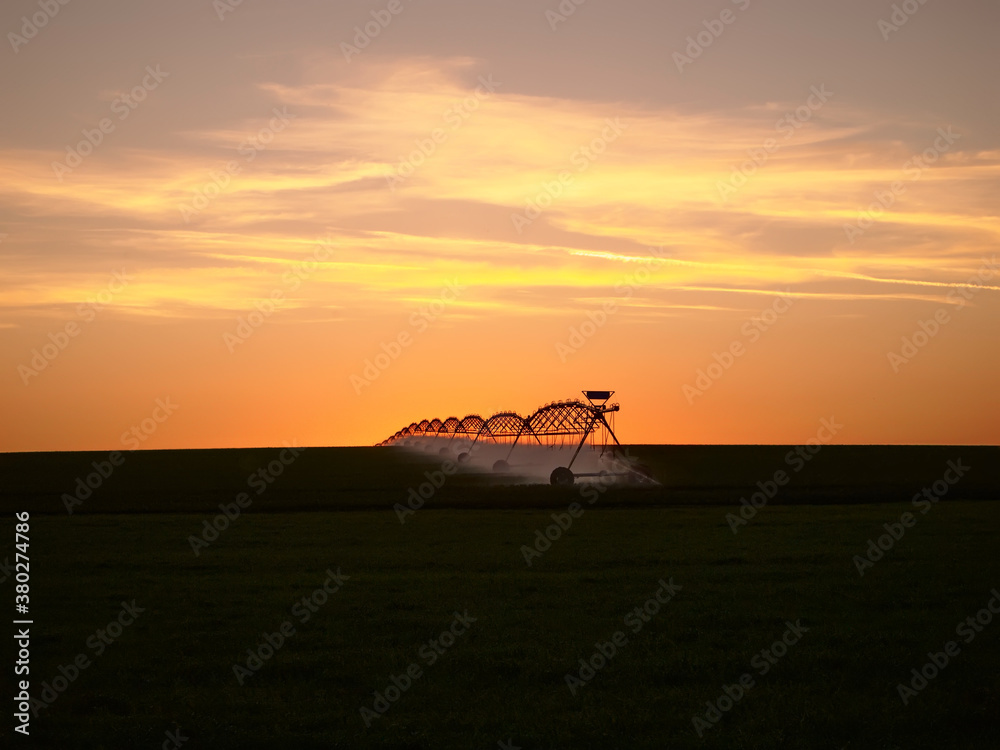 Tableau sur toile Center pivot irrigation system in the farm field at sunset