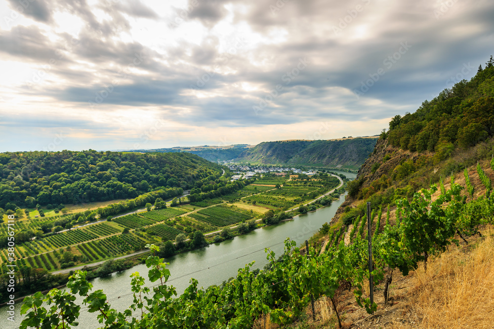 Tableau sur toile Winningen vineyards wine region, the Moselle river and Moselle Viaduct panoramic