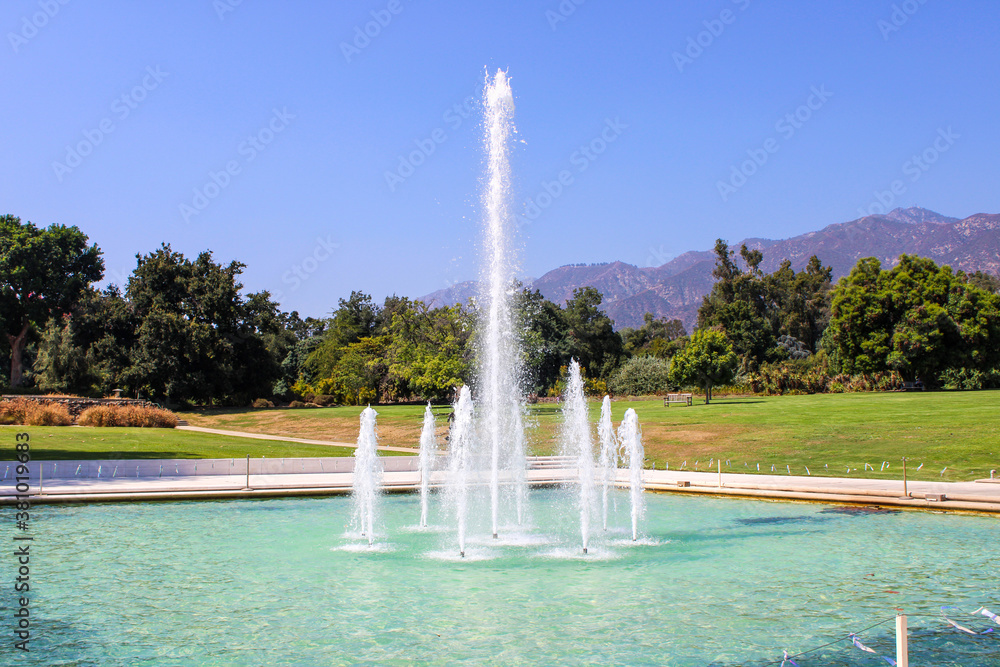 Tableau sur toile a gorgeous summer landscape at the LA Arboretum with a water fountain, lush gree