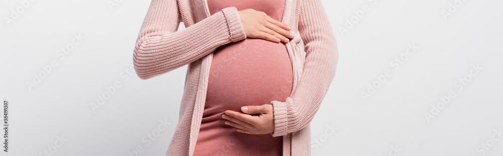 Tableau sur toile panoramic crop of pregnant woman touching belly isolated on white