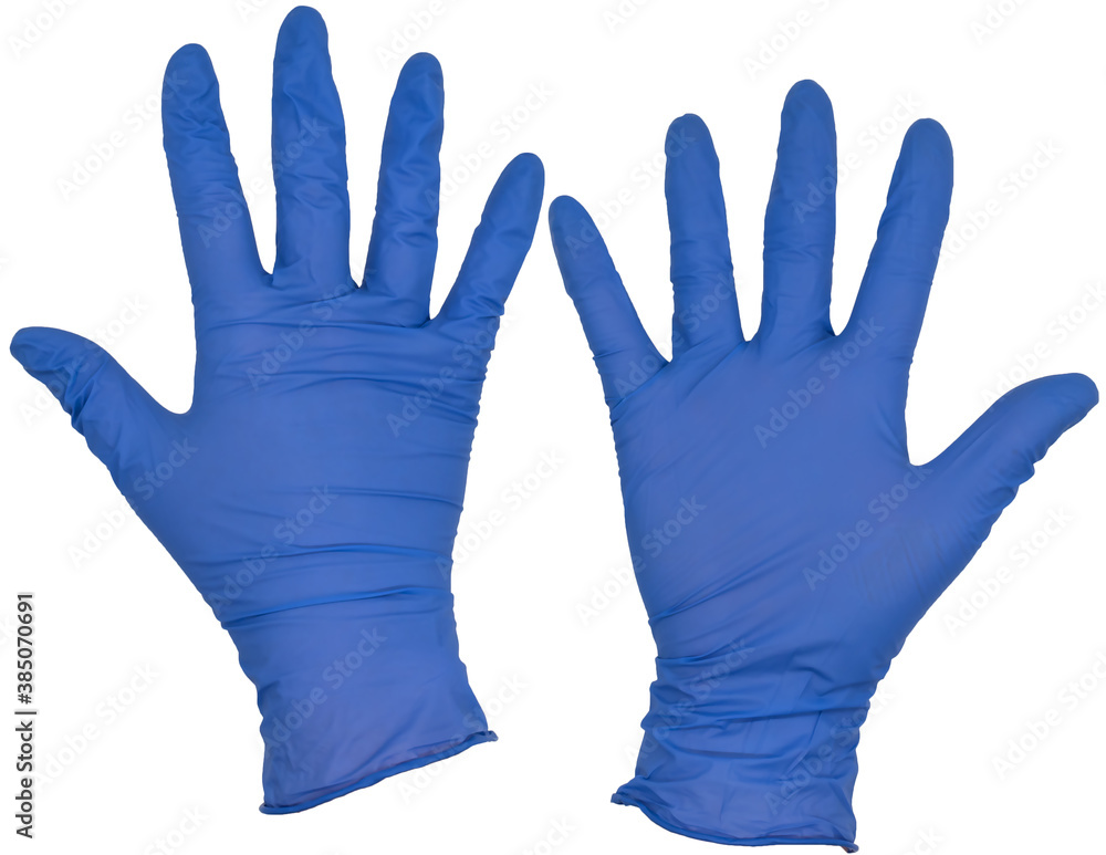 Tableau sur toile Isolated open hand wearing blue nitrile examination glove, fingers splayed and relaxed, thumb turned out