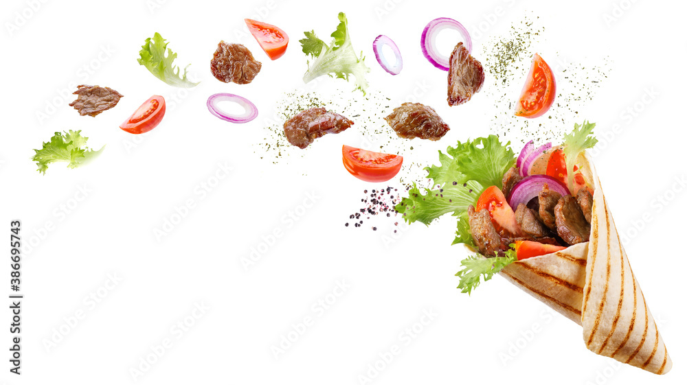 Tableau sur toile Doner kebab or shawarma with ingredients floating in the air : beef meat, lettuce, onion, tomatos, spice