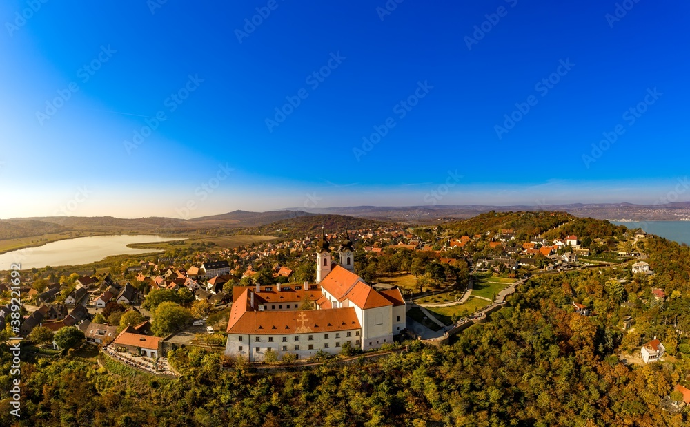 Tableau sur toile Tihany panoramic landscape with the abbey, lake Balaton, Hungary, autumn