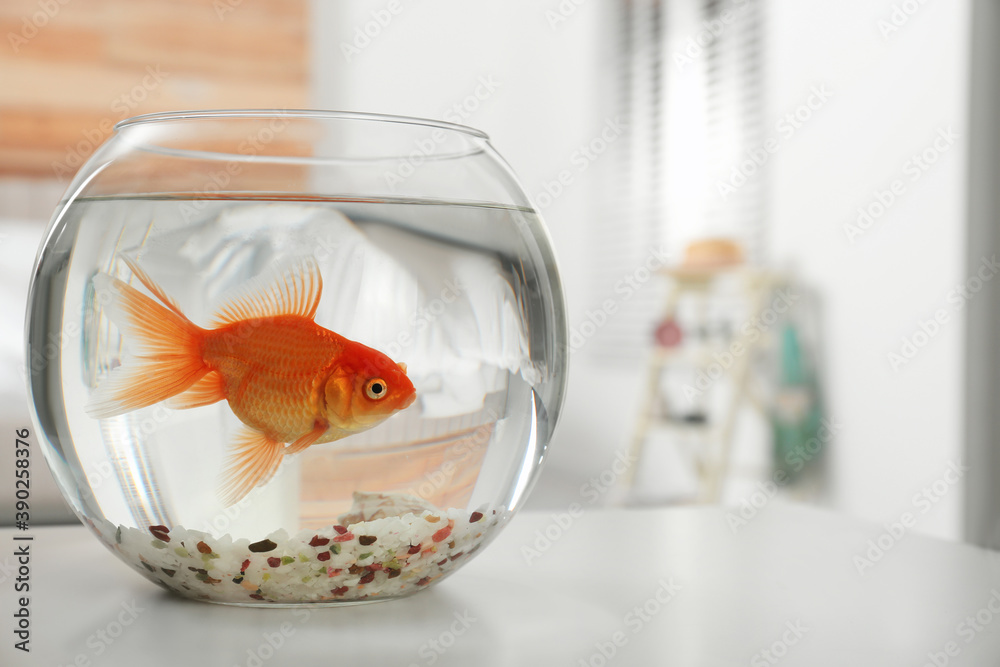Tableau sur toile Beautiful bright small goldfish in round glass aquarium on table indoors