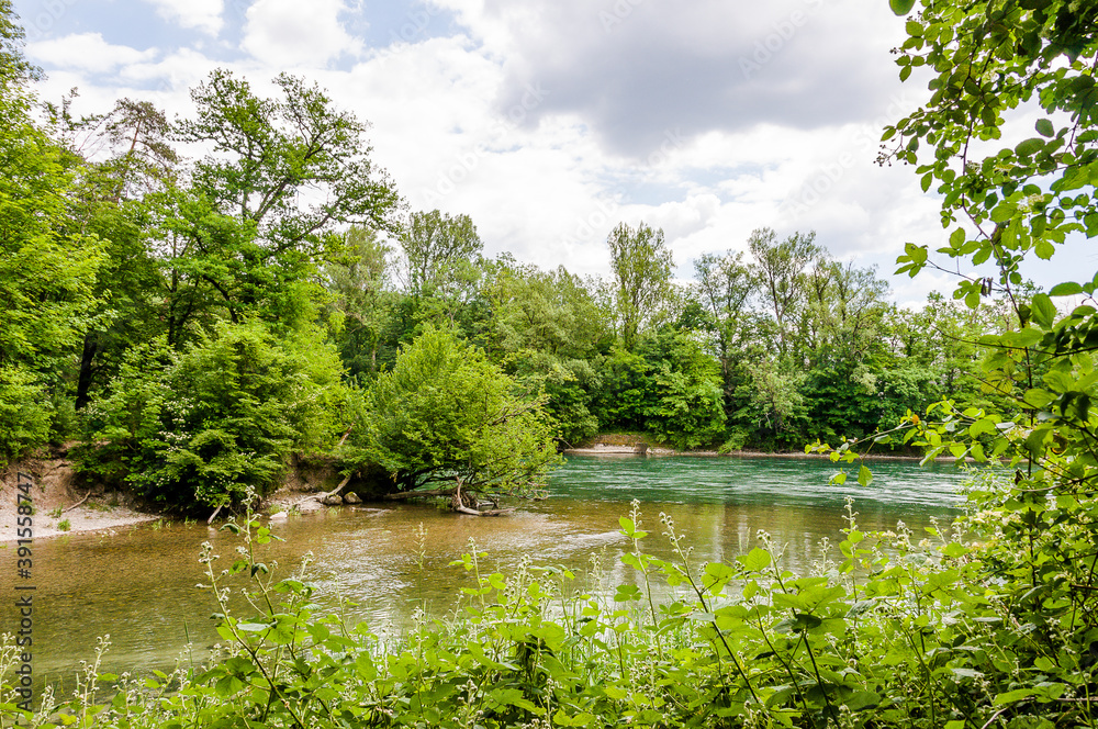 Tableau sur toile Brugg, Wasserschloss, Flusslandschaft, Aare, Fluss, Aareuferschutzgebiet, Wald,