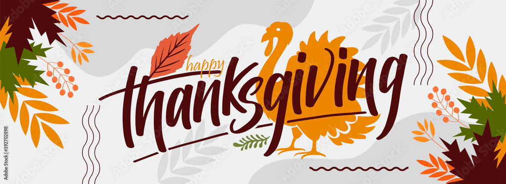Tableau sur toile happy thanksgiving banner design with typography, turkey bird and abstract leaves background