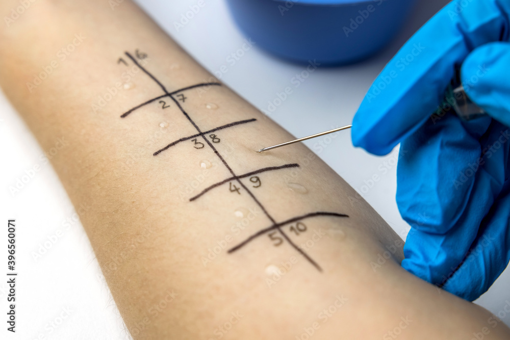 Tableau sur toile allergist doing skin prick allergy test on a patient arm closeup